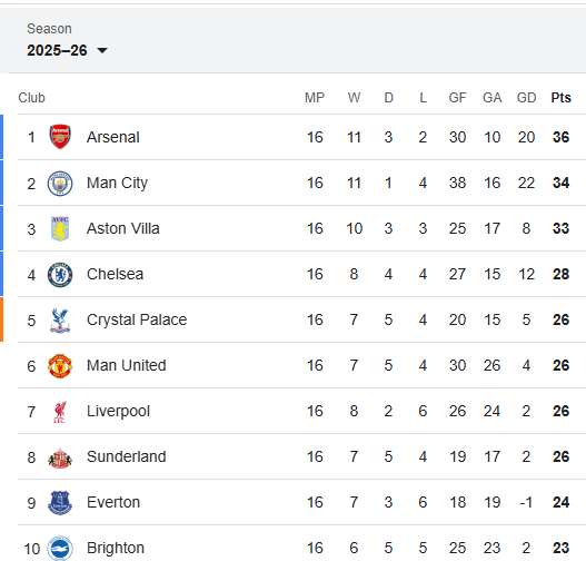 Hasil ini membuat Manchester United gagal menggeser Crystal Palace di peringkat lima. Skuad asuhan Ruben Amorim masih menempati urutan enam dengan 26 poin.